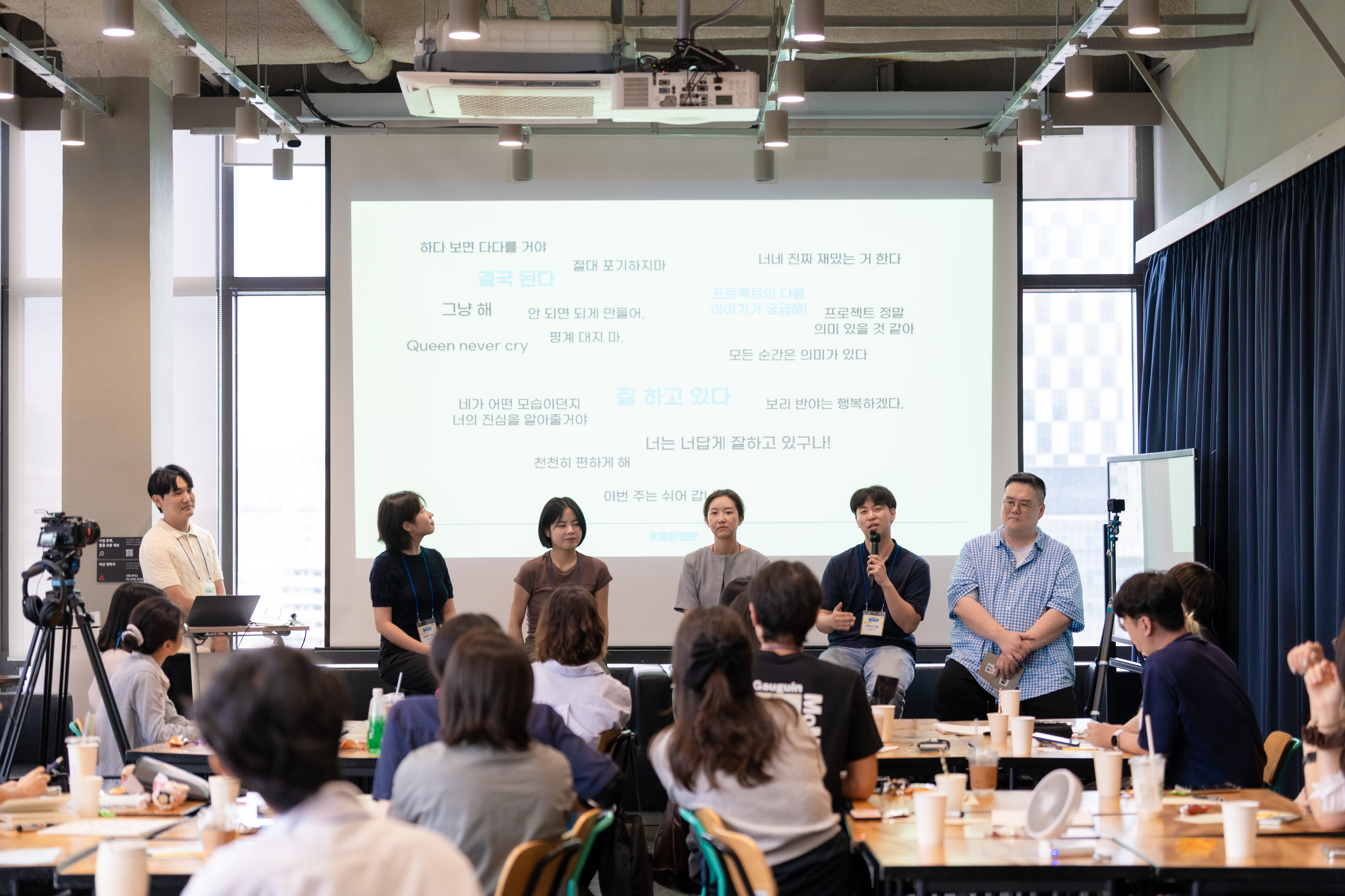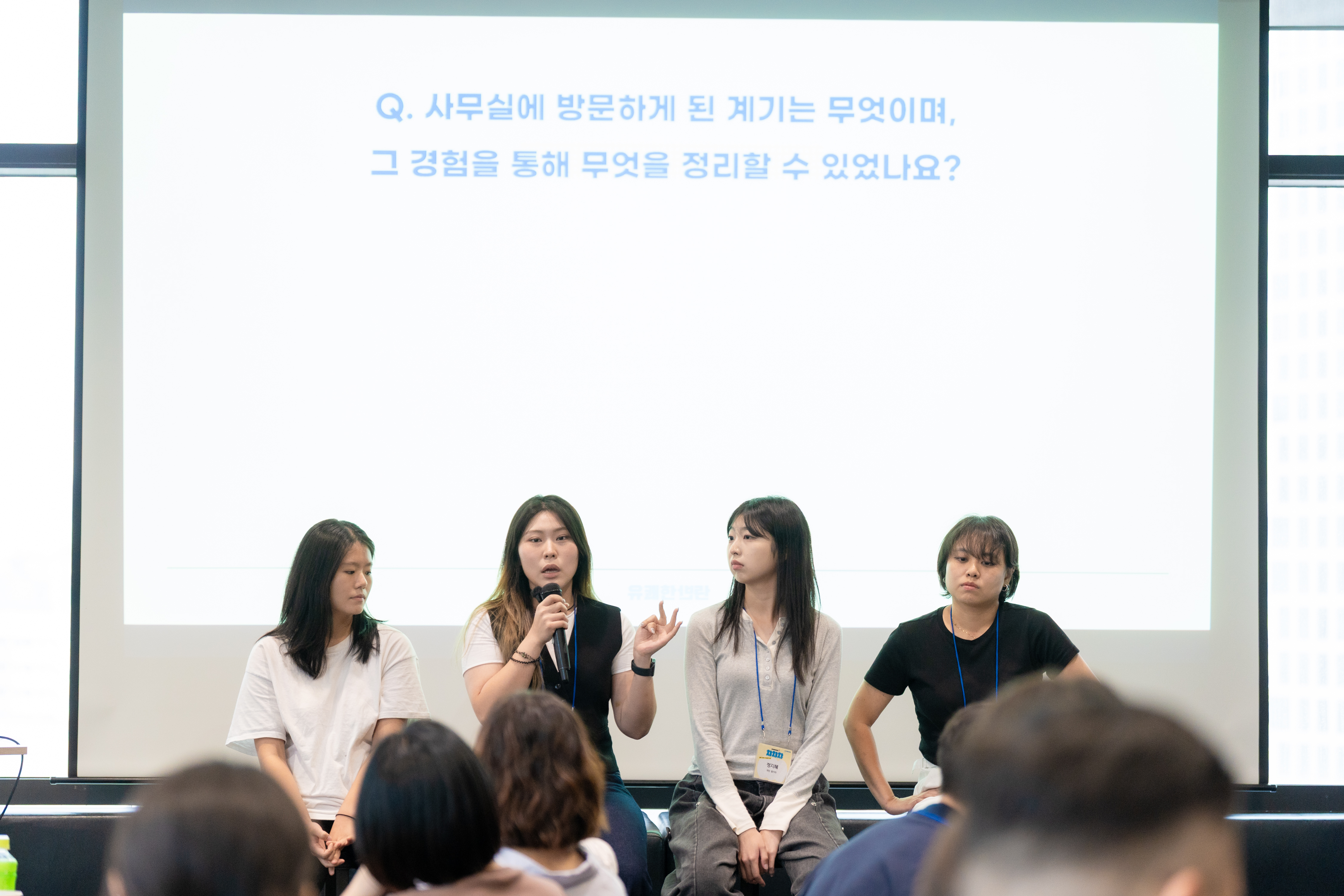 이후 운영위원들과의 토크콘서트 시간도 마련되었습니다. 사전에 참가자들이 구글폼으로 전했던 ‘듣고 싶었던 말’을 바탕으로, 운영위원들은 자신의 경험과 진심 어린 조언을 나누었어요.사단법인 온기 조현식 대표는 괴테의 ‘인간은 지향하는 한 방황한다.’라는 문장을 전하며, “참가자들이 ‘하고 싶은 일’을 시도하는 과정이 때론 힘들기도 하지만 조금씩 나아가고 있는 여정에 있다.”라며 따뜻한 응원의 메시지를 건넸습니다.